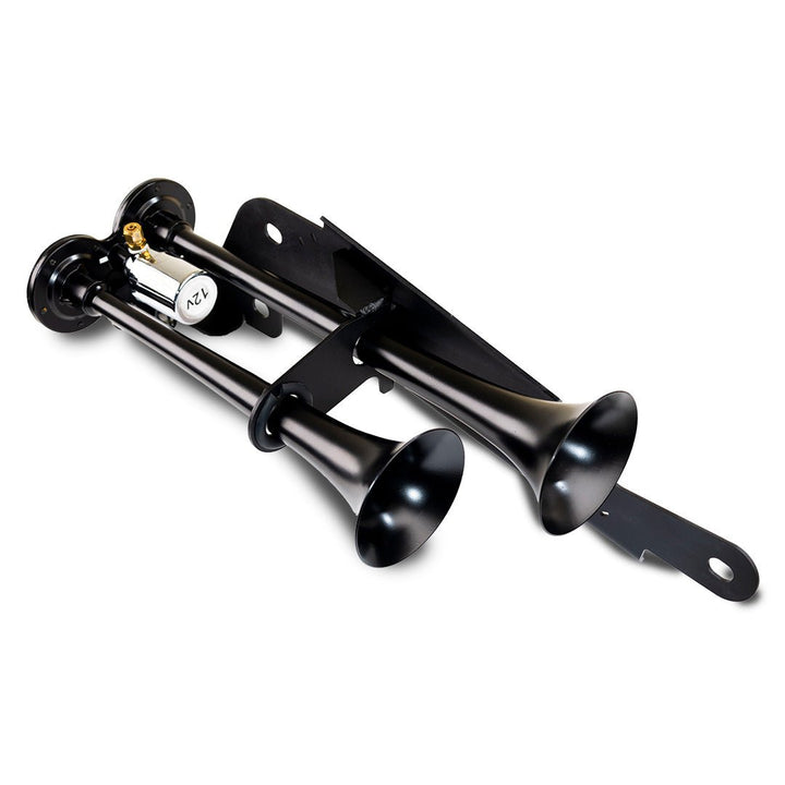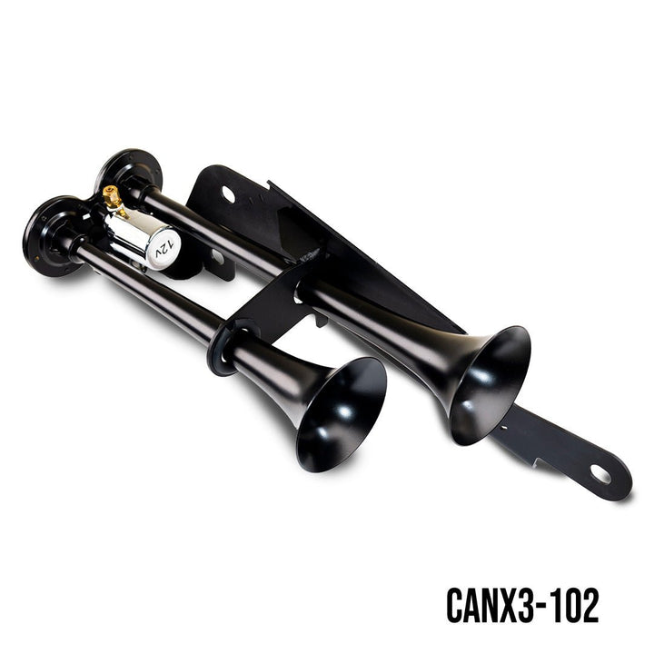Add-On dual air horn kit for the Can-Am X3 Maverick. This direct fit bolt-on kit allows you to add a Kleinn model 102-1 dual air horn to the Can-Am X3 Maverick. Kit requires an onboard air system with minimum ½ gallon air tank and 120 PSI air system. Includes Model 102-1 black dual air horns, direct fit Can-Am X3 Maverick mounting bracket, air line, fittings and horn button.